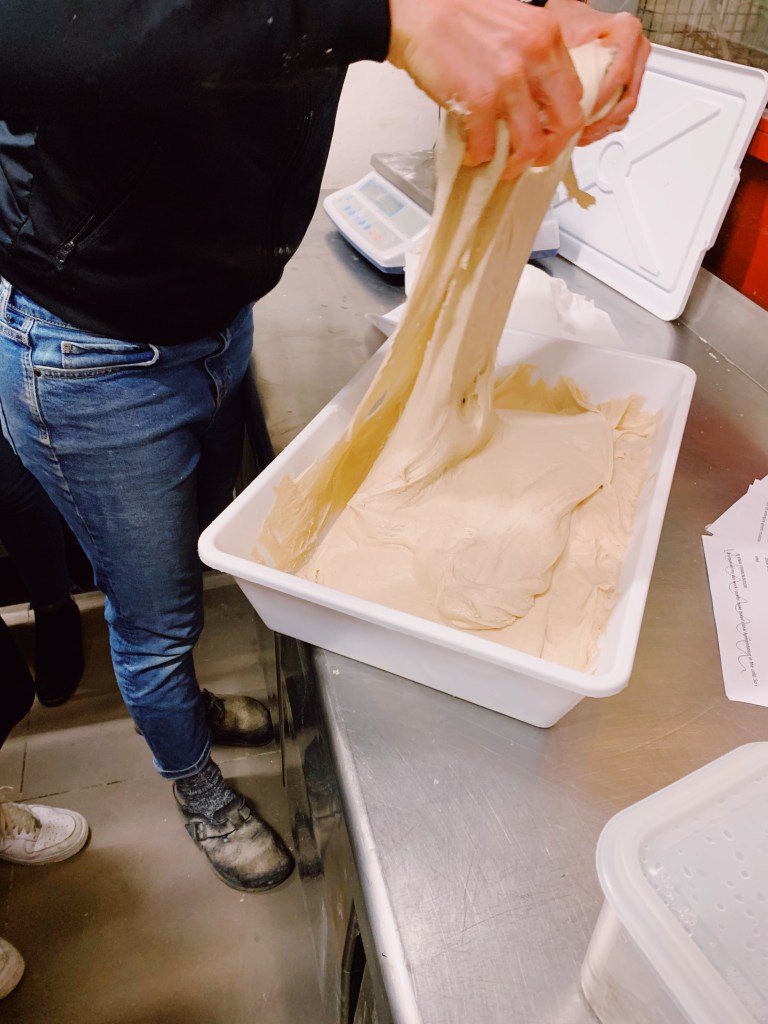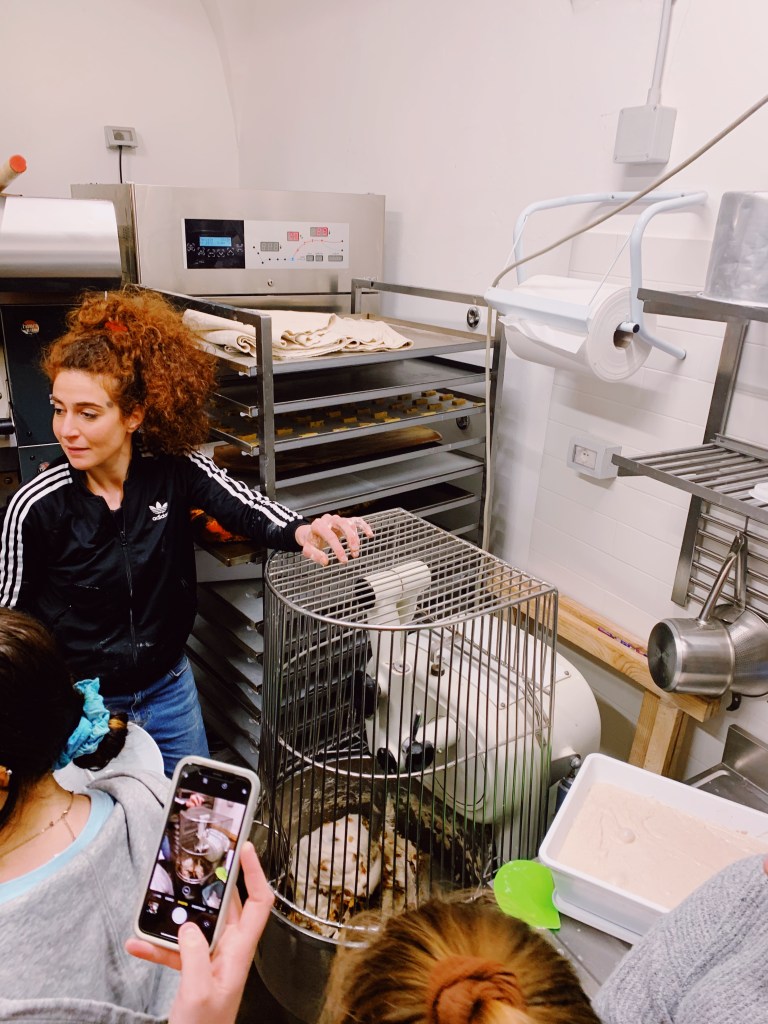 I was lucky enough to be joined by fellow students in learning the process of making sourdough bread. The owner, Lorenza, showed us the step-by-step process, and thoroughly explained the reasoning behind each step. At L’assalto, they use local, stone-milled flour that is minimally refined so that there are valuable nutrients still present. Then warm water is added to the flour; this allowed us to begin mixing and kneading the dough. To mix you must start from the outside and work your way in. Once the dough comes to a ball shape, it must rest for 30 minutes to let all of the water be absorbed by the flour. After 30 minutes, a portion of the sourdough starter (a mixture of flour and water that is “fed” with more of each everyday because it is alive) is added, which then can be mixed again, folding from the outside to the inside. Unfortunately we were not present for the baking of our bread because the dough needed much more time to rest, ferment, and rise. Eventually we were able to retrieve our baked bread and it was absolutely delicious!